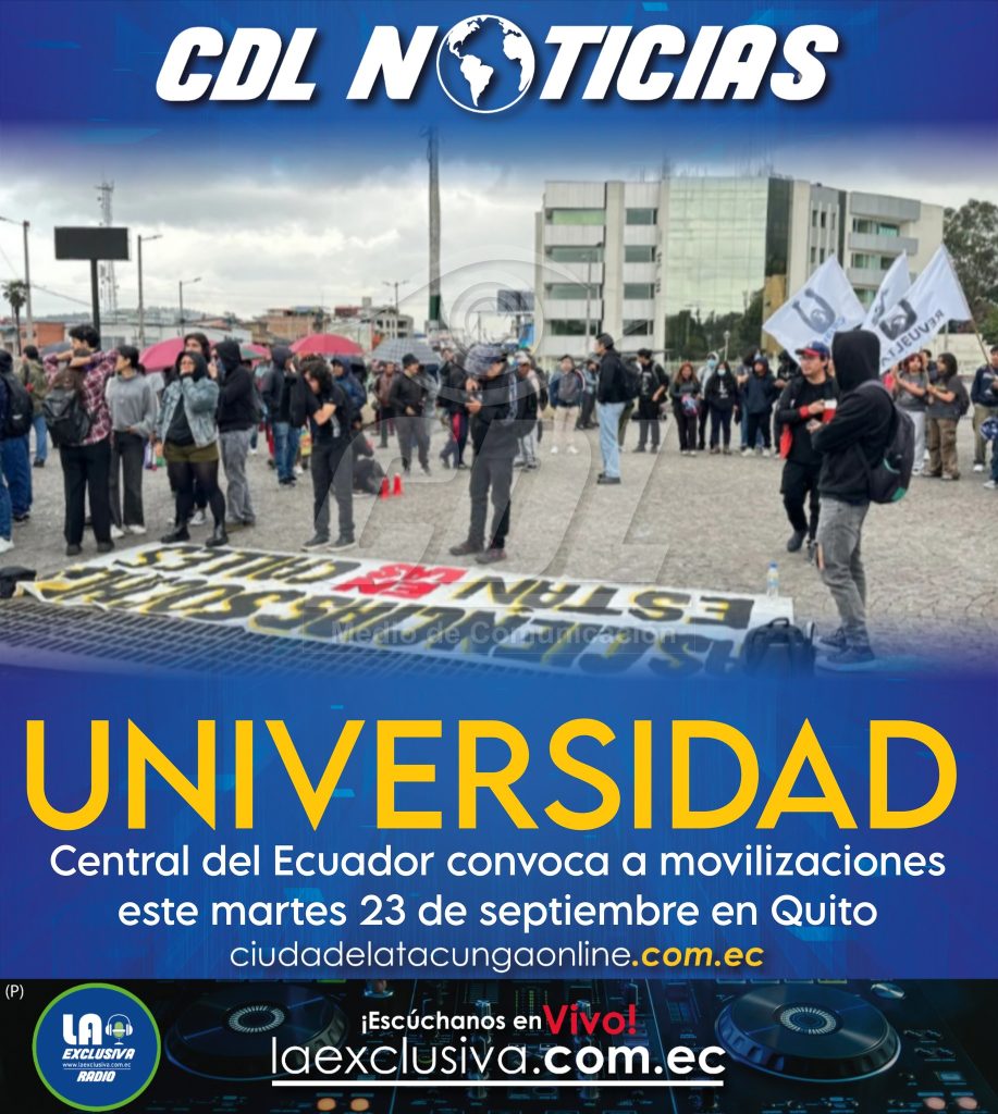 CDL Noticias https://ciudadelatacungaonline.com.ec/wp-content/uploads/2024/10/WhatsApp-Video-2025-09-19-at-11.52.34.mp4https://ciudadelatacungaonline.com.ec/wp-content/uploads/2024/05/WhatsApp-Video-2025-09-19-at-11.52.34-1.mp4https://ciudadelatacungaonline.com.ec/wp-content/uploads/2025/09/WhatsApp-Video-2025-09-19-at-11.52.34-3.mp4https://ciudadelatacungaonline.com.ec/wp-content/uploads/2025/09/WhatsApp-Video-2025-09-19-at-11.52.34-2.mp4 El Ministerio de Educación, Deporte y Cultura activó el Plan de Continuidad Educativa en seis distritos de Ecuador por el paro. El Ministerio de Educación, Deporte y Cultura informó, la noche del lunes 22 de septiembre del 2025, que activó el Plan de Continuidad Educativa en seis distritos de Ecuador ante las violentas protestas. Ecuador enfrenta su primer día de paro nacional por la eliminación del subsidio al diésel. Las manifestaciones estuvieron marcadas por la violencia, que dejan al menos 50 detenidos, varios heridos y daños materiales. Con el objetivo de «proteger el bienestar de estudiantes, docentes y familias» y «garantizar la continuidad del proceso educativo», se aplicará esta acción preventiva. Las clases no presenciales se aplicarán el martes 23 de septiembre en las siguientes 11 localidades: Ibarra – Pimampiro – Urcuquí Otavalo – Antonio Ante CotacachiOrellana – LoretoCayambe – Pedro MoncayoLatacunga «El Ministerio continuará evaluando la situación en cada zona y mantendrá a la ciudadanía informada sobre cualquier actualización», indicó la Cartera de Estado en un comunicado. https://ciudadelatacungaonline.com.ec/wp-content/uploads/2025/08/PROMO-POSGRADOS.mp4https://ciudadelatacungaonline.com.ec/wp-content/uploads/2025/08/PROMO-UTC-General.mp4