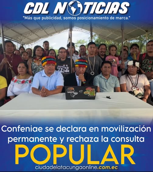 CDL Noticias https://ciudadelatacungaonline.com.ec/wp-content/uploads/2024/10/WhatsApp-Video-2025-09-19-at-11.52.34.mp4https://ciudadelatacungaonline.com.ec/wp-content/uploads/2024/05/WhatsApp-Video-2025-09-19-at-11.52.34-1.mp4https://ciudadelatacungaonline.com.ec/wp-content/uploads/2025/09/WhatsApp-Video-2025-09-19-at-11.52.34-3.mp4https://ciudadelatacungaonline.com.ec/wp-content/uploads/2025/09/WhatsApp-Video-2025-09-19-at-11.52.34-2.mp4 La Confederación de Nacionalidades Indígenas de la Amazonía Ecuatoriana (Confeniae), filial de la Conaie y representante de 11 nacionalidades indígenas, anunció este sábado 18 de octubre que se declara en movilización permanente en defensa del territorio, la vida y los derechos colectivos. La decisión fue adoptada durante una asamblea extraordinaria autoconvocada por los presidentes de las nacionalidades base, con la participación del titular de la Conaie, Marlon Vargas, y otros dirigentes del movimiento indígena. Entre las resoluciones aprobadas destacan el rechazo a la consulta popular y referéndum convocados para el próximo 16 de noviembre, en especial a la pregunta sobre la conformación de una Asamblea Constituyente para redactar una nueva Constitución. Según la Confeniae, esta propuesta «atenta contra los derechos conquistados» y distrae la atención de la crisis ambiental y social provocada por las actividades petroleras y mineras en la Amazonía. La organización también expresó solidaridad con la provincia de Imbabura, donde las protestas contra el Gobierno de Daniel Noboa cumplen 27 días, y condenó la represión y el cierre de radios comunitarias. Además, rechazó la ronda petrolera suroriente y el catastro minero, por considerar que amenazan los territorios ancestrales. Finalmente, la Confeniae desconoció a la Secretaría de Pueblos y Nacionalidades, entidad adscrita al Ejecutivo, a la que acusa de fomentar la división dentro del movimiento indígena amazónico. https://ciudadelatacungaonline.com.ec/wp-content/uploads/2025/08/PROMO-POSGRADOS.mp4https://ciudadelatacungaonline.com.ec/wp-content/uploads/2025/08/PROMO-UTC-General.mp4