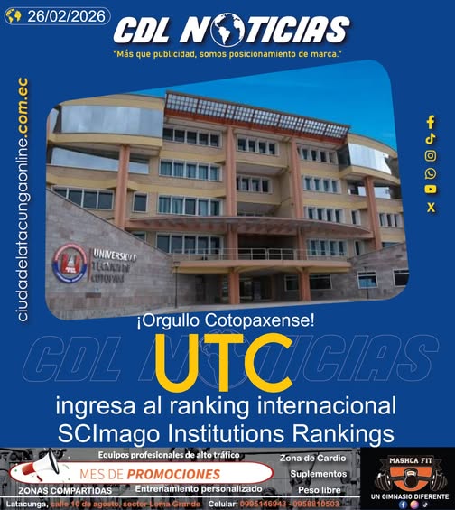 CDL Noticias La Universidad Técnica de Cotopaxi (UTC) continúa fortaleciendo su posicionamiento académico al formar parte del SCImago Institutions Rankings (SIR), un referente internacional que evalúa a universidades e instituciones de investigación en función de su producción científica, innovación e impacto social. En esta medición, la UTC destaca especialmente en indicadores relacionados con el impacto social y la visibilidad científica, reflejando el compromiso institucional con la generación de conocimiento pertinente, la proyección de sus publicaciones académicas y el aporte al desarrollo sostenible. El SCImago Institutions Rankings analiza variables como desempeño en investigación, resultados en innovación y presencia social medida a través de indicadores de visibilidad web, convirtiéndose en una herramienta clave para medir la evolución y competitividad de las universidades a escala global. La presencia de la UTC en este ranking internacional representa un avance significativo en su consolidación académica, ya que: Reconoce la calidad y evolución de su investigación. Fortalece su reputación en el ámbito internacional. Amplía oportunidades de cooperación científica. Genera mayor confianza en estudiantes y futuros profesionales. Con este logro, la Universidad Técnica de Cotopaxi reafirma su proyección nacional e internacional, evidenciando que desde la provincia se impulsa conocimiento con impacto real y compromiso social.