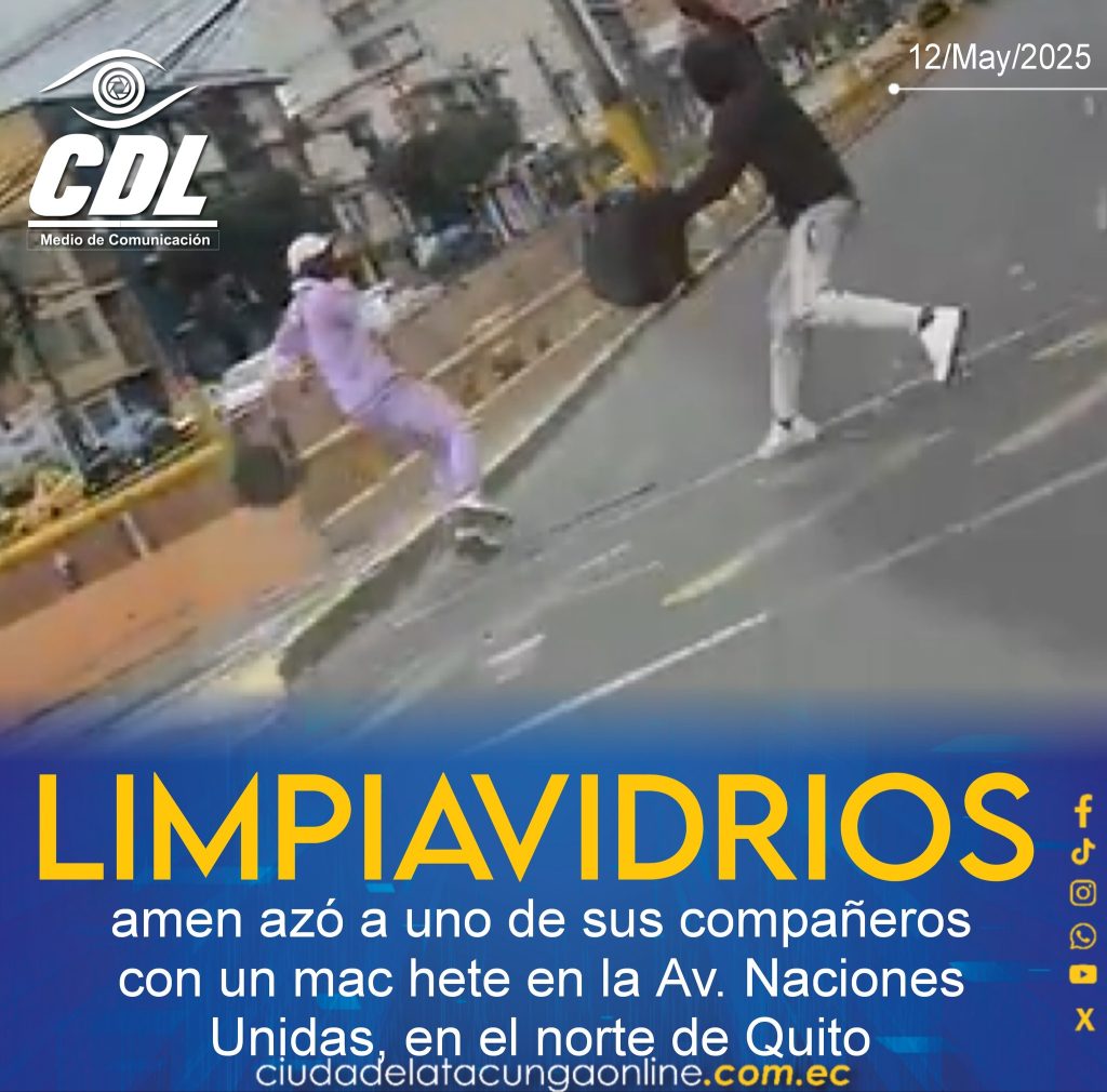 CDL Noticias Un limpiavidrios amenazó con un machete a uno de sus compañeros en la Av. Naciones Unidas. Conozca más sobre este que se registró a plena luz del día. Un video en redes sociales muestra a un limpiavidrios sacar un machete para agredir a uno de sus compañeros en la Av. Naciones Unidas y Av. 10 de Agosto, al norte de Quito, este 12 de mayo de 2025. El material, publicado en la cuenta de X del ciudadano José Velasteguí, capta el momento exacto en que dos hombres empiezan una riña en la mitad de la vía; uno de ellos lo amenaza con un machete. Se ve al hombre correr hacia su compañero en la intersección de la avenida 10 de Agosto, en sentido norte sur, con el afán de golpearlo. “De entre los matorrales, un limpiavidrios saca un machete para darse a plena luz del día con alguno de sus rivales; un agente de la AMT no hace nada. Esta gente está aquí todos los días y uno tiene que caminar como si nada”, relató el hombre en su cuenta personal. Velasteguí hace un llamado a las autoridades municipales, pues indicó que a metros de dónde ocurrió el incidente estaba un agente de la Agencia Metropolitana de Tránsito (AMT), que podía alertar al Servicio Integrado de Seguridad ECU 911. La violencia en Quito va en aumentoLa madrugada del 11 de mayo de 2025, dos personas fueron halladas sin vida y con signos de violencia, en el sector de El Troje, al suroriente de Quito, la madrugada de este domingo. Uno de los fallecidos fue decapitado y su cabeza fue encontrada a varios metros del cuerpo. Los agentes de la Dirección Nacional de Delitos contra la Vida y Muertes Violentas, Desapariciones, Extorsiones y Secuestros (Dinased) acudieron al sitio para hacer el levantamiento de los cadáveres y confirmaron que no portaban documentos de identidad.