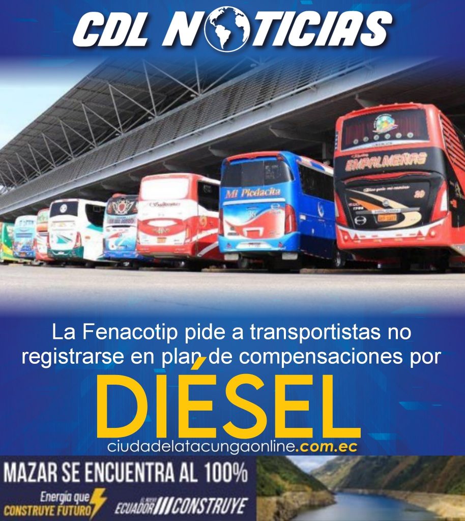 CDL Noticias PUBLICIDAD https://ciudadelatacungaonline.com.ec/wp-content/uploads/2025/08/PROMO-POSGRADOS.mp4https://ciudadelatacungaonline.com.ec/wp-content/uploads/2025/08/PROMO-UTC-General.mp4https://ciudadelatacungaonline.com.ec/wp-content/uploads/2024/10/Táctico-SP-16-9-SUBS.mp4 PUBLICIDAD PUBLICIDAD https://ciudadelatacungaonline.com.ec/wp-content/uploads/2025/09/Video-nuevas-obras-de-transmisión.mp4 La Federación Nacional de Cooperativas de Transporte Público de Pasajeros del Ecuador (Fenacotip) pidió a los transportistas intercantonales e interprovinciales que no se registren en el programa del Gobierno Nacional para recibir hasta mil dólares mensuales como compensación por la eliminación del subsidio del diésel. «Solicitamos a los directivos y socios de nuestras filiales que no se registren en el enlace que ha sido remitido por el Ministerio de Infraestructura y Transporte (MIT) hasta no contar con una resolución de nuestro máximo órgano de gobierno, como lo es la Asamblea General», señala un comunicado de la Fenacotip. Esa asamblea ha sido convocada para el lunes 15 de septiembre, sin embargo, el titular del MIT, Roberto Luque, anunció que este lunes se realizarán los primeros desembolsos a quienes se hayan registrado hasta este domingo 14 de septiembre. El plan del Gobierno de Daniel Noboa es pagar entre 400 y 700 dólares al mes a cada unidad de transporte intercantonal, USD 600 por cada unidad intraprovincial y USD 1 000 por cada vehículo interprovincial. El Ejecutivo destinará USD 68,7 millones para pagar estos incentivos en este año. El ministro Luque explicó que el registro estará habilitado permanentemente y que, durante este mes, se realizarán pagos los lunes o jueves. El Gobierno recalca que será un solo pago mensual. Por otra parte, la Fenacotip, con 13 000 socios en todo el país, subrayó que el alza del precio del diésel genera «un gran impacto económico» en las operaciones del transporte público. La organización recalcó que solo el lunes, tras su asamblea, anunciarán las medidas que adoptarán. La eliminación de los subsidios de los combustibles es una de las decisiones políticas más sensibles en Ecuador que ya intentaron tomar sin éxito los expresidentes Lenin Moreno (2017-2021) y Guillermo Lasso (2021-2023), quienes tuvieron que recular ante las dos olas de protestas más grandes acontecidas en los últimos años en el país, lideradas en ambas ocasiones por el movimiento indígena. El jefe de Estado dio el paso de eliminar el subsidio al diésel tras haberlo hecho ya el año pasado con las gasolinas Extra y Ecopaís, las de mayor consumo en la nación. Desde esta sábado 13 de septiembre, cada galón de diésel pasó a costar USD 2,80. Hasta el viernes se vendió en USD 1,80. El Ejecutivo tiene previsto ahorrar hasta 1 100 millones de dólares al año por la eliminación del subsidio del diésel. Parte de ese dinero se destinará a bonos y compensaciones. Los transportistas de Pichincha ya han anunciado una paralización del servicio público el lunes 15 de septiembre en respuesta a la eliminación del subsidio. De su lado, la Confederación de Nacionalidades Indígenas del Ecuador (Conaie) consideró que la decisión es un «nuevo paquetazo» por parte de la Administración de Noboa. La organización advirtió que «el Gobierno está llevando al límite la paciencia popular». https://ciudadelatacungaonline.com.ec/wp-content/uploads/2025/08/PROMO-POSGRADOS.mp4https://ciudadelatacungaonline.com.ec/wp-content/uploads/2025/08/PROMO-UTC-General.mp4https://ciudadelatacungaonline.com.ec/wp-content/uploads/2024/10/Táctico-SP-16-9-SUBS.mp4