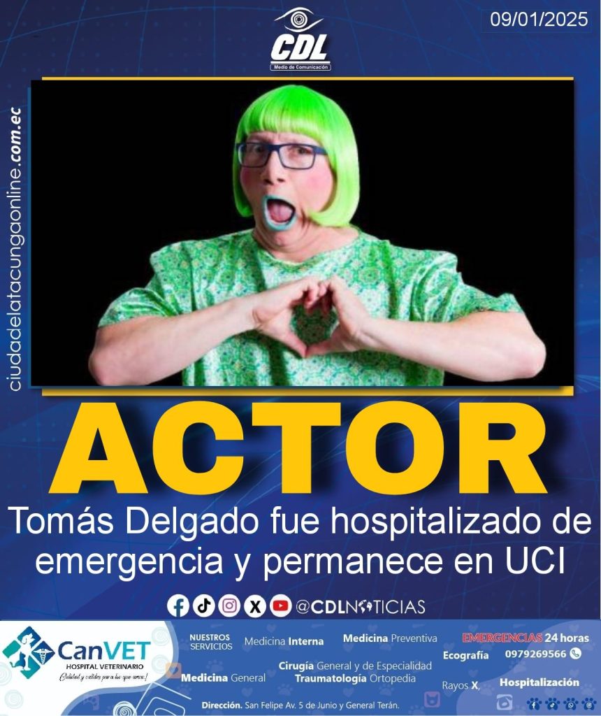 El actor y comediante Tomás Delgado, reconocido por su popular personaje de La Vecina, fue internado de emergencia en la Unidad de Cuidados Intensivos (UCI) en una casa de salud de Guayaquil. La noticia fue confirmada por su expareja, la presentadora Carla Tacle.