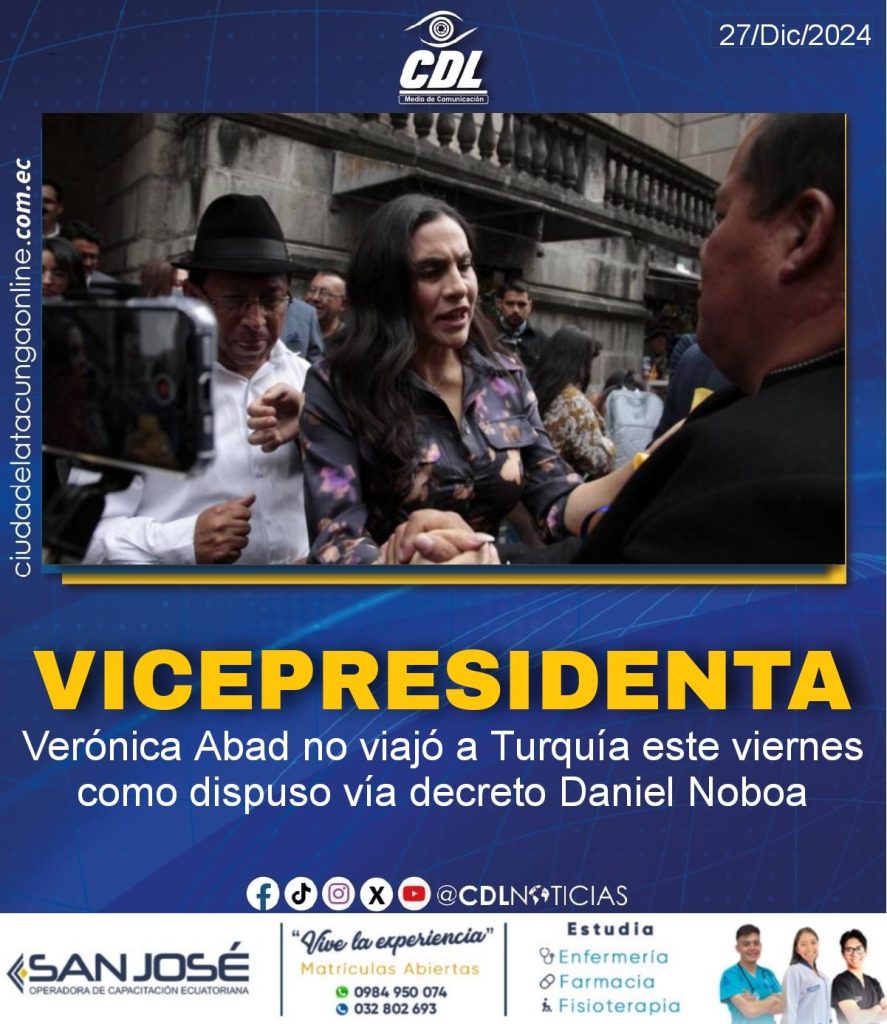 La vicepresidenta Verónica Abad debía presentarse hoy en Turquía, pero no viajó. El lunes, cuando la jueza Nubia Vera dejó sin efecto su suspensión de 150 días sin remuneración, el presidente Daniel Noboa la nombró consejera temporal y dispuso su traslado hasta hoy.