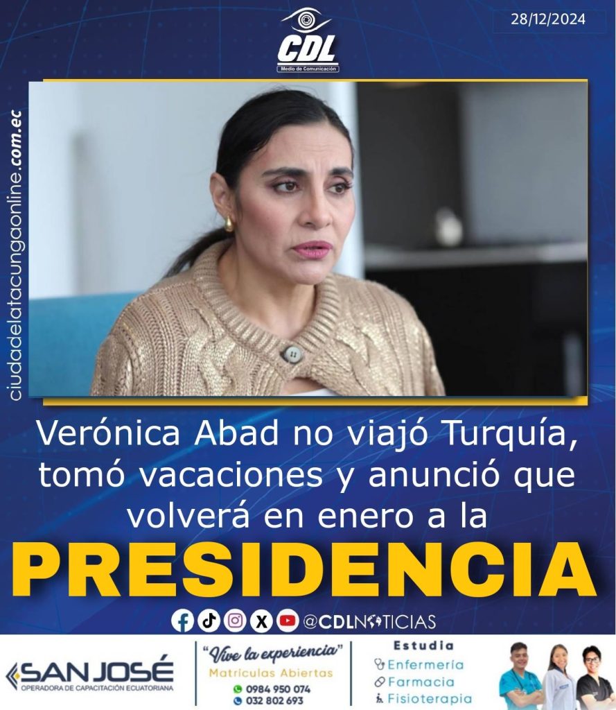 La vicepresidenta de la República, Verónica Abad, envió un documento al presidente Daniel Noboa la noche del viernes 27 de diciembre del 2024. Allí Abad informó al Gobierno que ejercerá su derecho de tomar vacaciones hasta el 3 de enero del 2025. Esto porque ha trabajado más de un año sin tomar descanso.